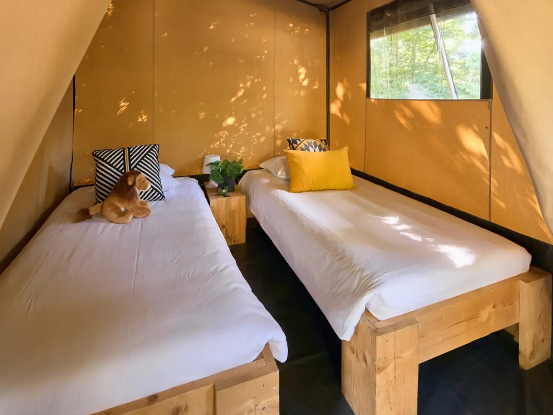The Bungalow tent consists of 2 sleeping cabins and 1 living area with a kitchen sink. For hot water, a shower and toilet, you can use the modern sanitary facilities in the immediate vicinity of the tent.